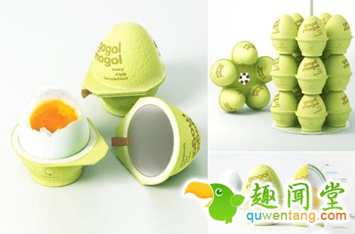 Gogol Mogol 是一个能煮熟鸡蛋的包装盒设计,每个鸡蛋由多层回收纸板包装,第一层是普通纸板,第二层是催化剂,第三层是智能材料。当你拉出标签时,催化剂与智能材料随即发生化学反应,鸡蛋开始升温,几分钟后,你就会拥有一个煮熟的鸡蛋。