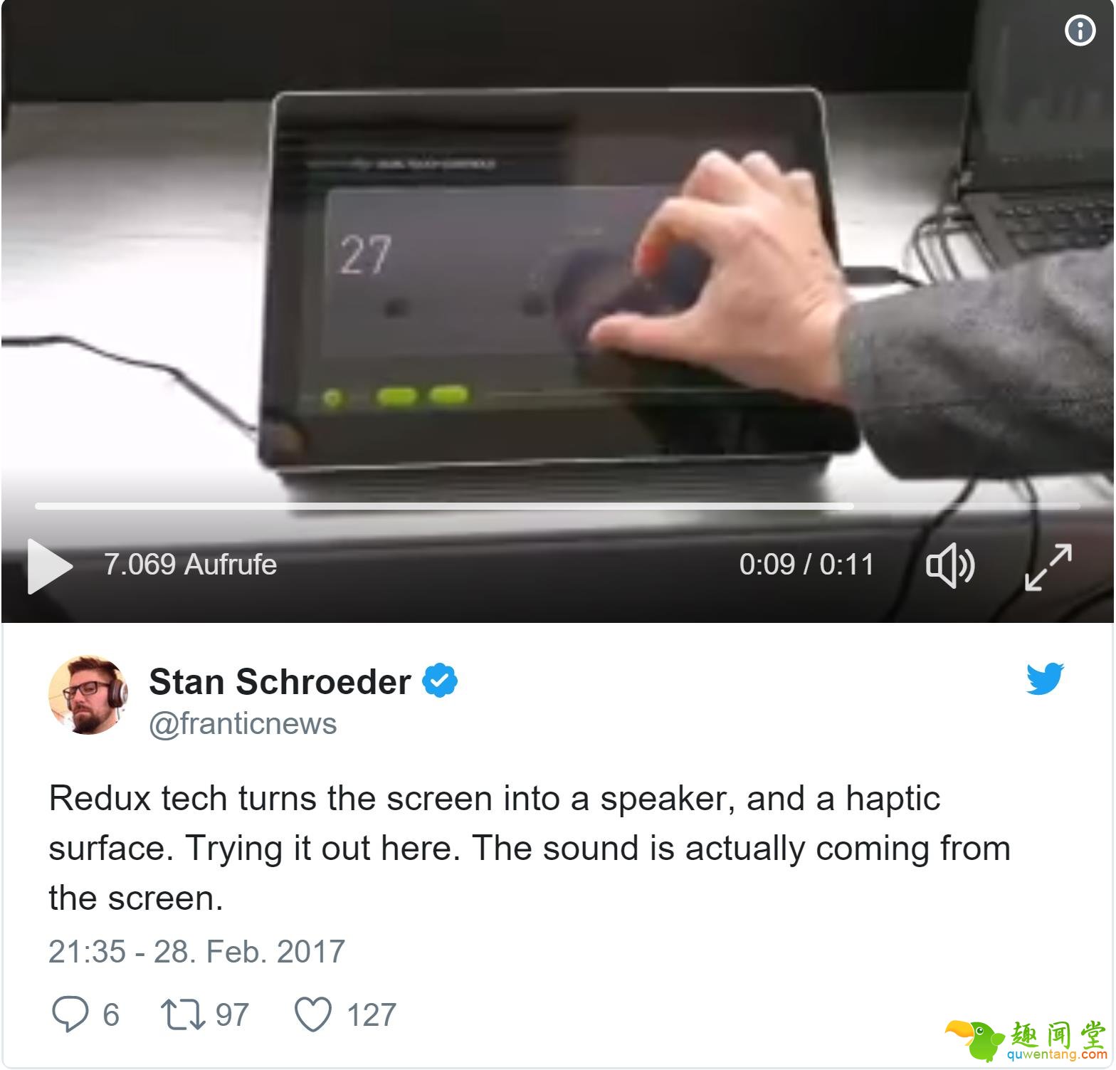 在2017年2月的MWC上,英国新兴公司Redux展示了一种有趣的技术,能够让设备不通过扬声器,直接通过屏幕来播放声音。其实在电视行业这个技术并不算特别新鲜,例如CES2018上的索尼第二代Bravia A系列就支持Acoustic Surface功能,而CES2017上LG也曾展示过一种类似的名为Crystal Sound的技术。