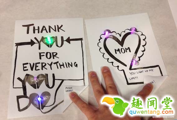 ▼用Circuit Maker绘制的卡片十分有特色,当大家按下角落的按钮时,用电路绘制笔画出的卡片就会通电发亮,一闪一闪的,非常别出心裁。
