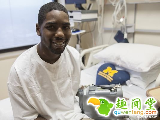 经历过一年多穿戴人工心脏设备的生活后,25岁的Stan Larkin重返密歇根大学弗兰克尔心血管中心进行心脏移植