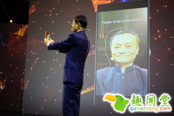 马云在台上直接演示了支付宝的人脸支付功能,同时还把手机上的实时画面传输到大屏幕上,因此也就有了下图中这张罕见的自拍照。