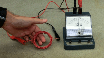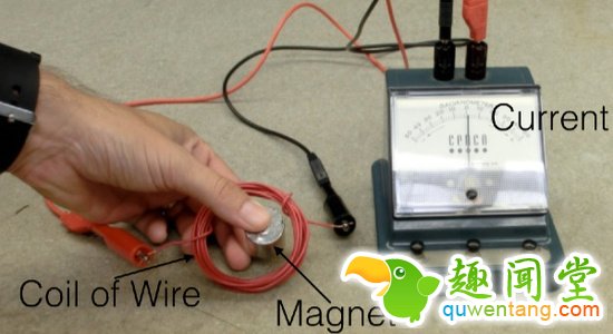 先做个小示范。我这里有一卷与电流计相连的电线。在红色的电线圈里面放了一个强力磁铁。