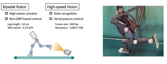 系统使用一台高速相机拍校正自身姿态,从而使机器人可以快速奔跑而不会摔倒。