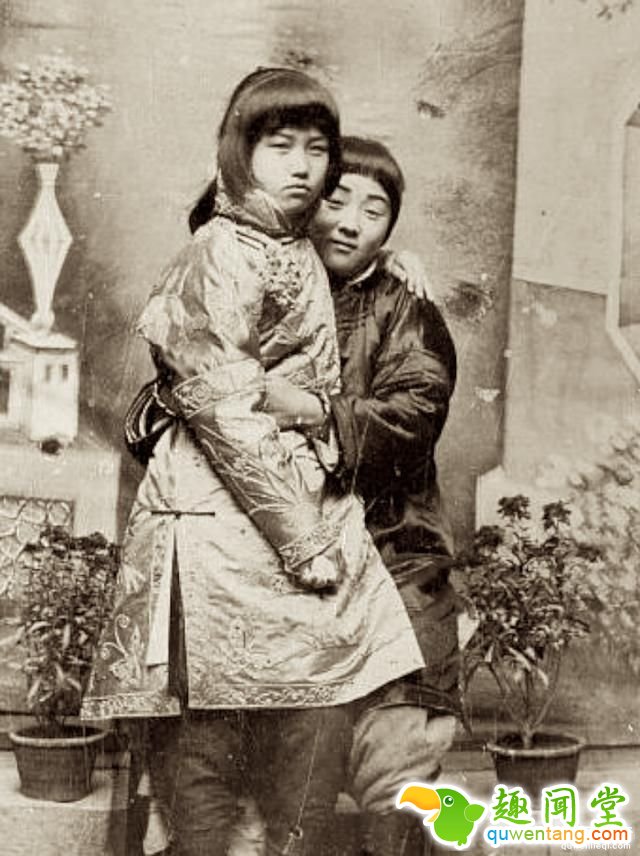 百年前晚清女子的真实形象:图为晚清的两个年轻女孩,拥抱在一起合影。