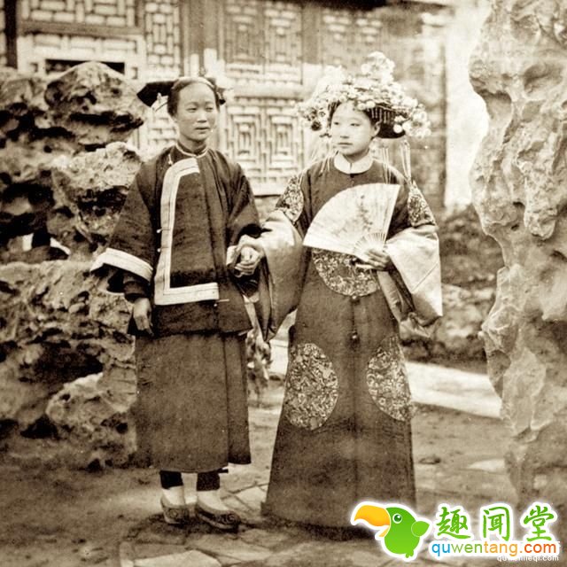 百年前晚清女子的真实形象:图为晚清两个妇女在后花园拍照,其中一个手上拿着一把纸扇。