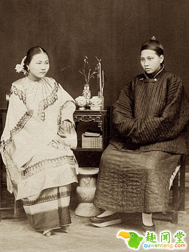 百年前晚清女子的真实形象:图为晚清的两个女子,右边的男子是女扮男装。
