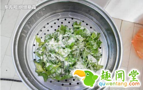 4、蒸锅入水,再把裹上面粉的芹菜叶子放进去蒸。