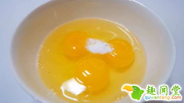 ▼2.把3颗蛋打入碗中,加入少许盐搅拌打均匀。