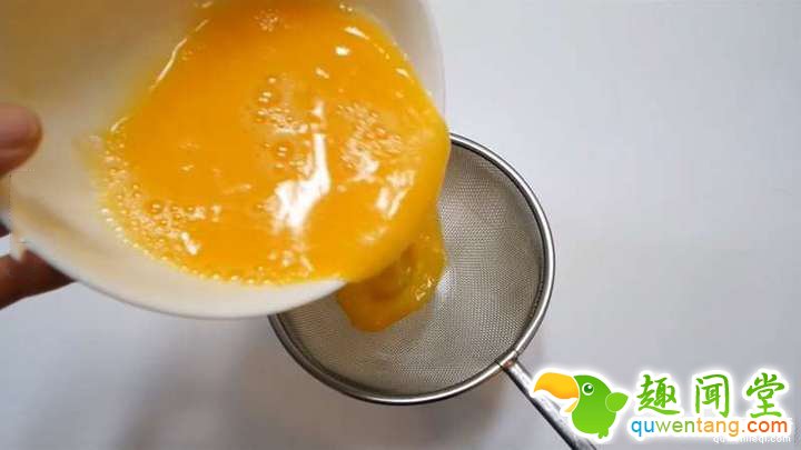 ▼3.蛋液搅拌均过筛,让蛋液变得更加细致。