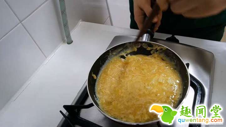 ▼4.在预热后平底锅中薄薄的一层变厚再倒入蛋液。请注意一开始请不断搅拌,熟至图片中的程度时,再把火转小,并放上起司条。