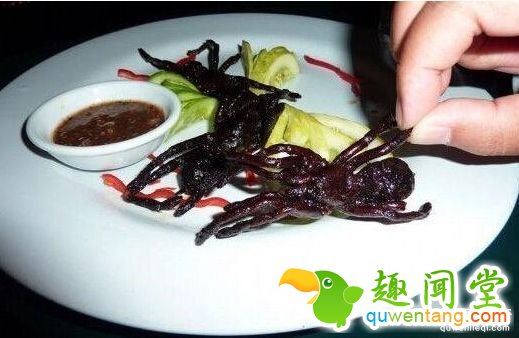 油炸毒蜘蛛是柬埔寨特有的小吃,以肥硕、味美闻名于世。油炸过后的毒蜘蛛外壳酥脆,内里却是鲜嫩多汁,吃起来的味道比较像炸鸡,也有点像鳕鱼。说来这种毒蜘蛛也非常特别,它不像我们印象中的蜘蛛,靠着凌空结网而居,而是生长在地下,以草根为食。毒蜘蛛除了油炸,还可以烘焙。它的烹饪过程也是非常简单的,首先去掉毒牙,加热,熟了之后就可以拿来食用了。