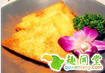 3、取锅,倒入约半锅份量的油烧热至约120℃后,再将作法2的吐司放入锅中炸至表面呈金黄色后,捞起沥油。