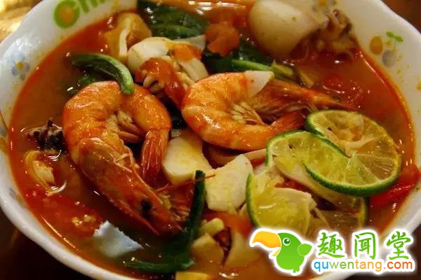 这道泰国标志性美食中添加了虾、蘑菇、西红柿、柠檬草、高良姜和柠檬叶,通?;够峒有┮毯湍逃汀K诤狭硕嘀秩嗣亲畎奶┕缥叮核?、咸、辣、甜,深受人们钟爱。