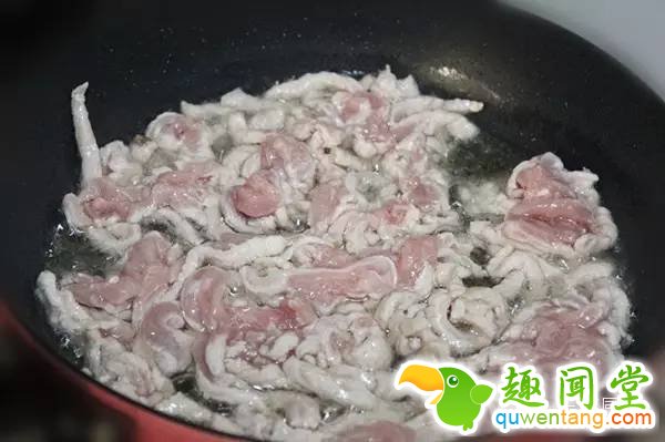 第六步:锅中加入适量的油,油热后,将肉丝放入锅中。煸炒至肉丝发白即可盛出备用。