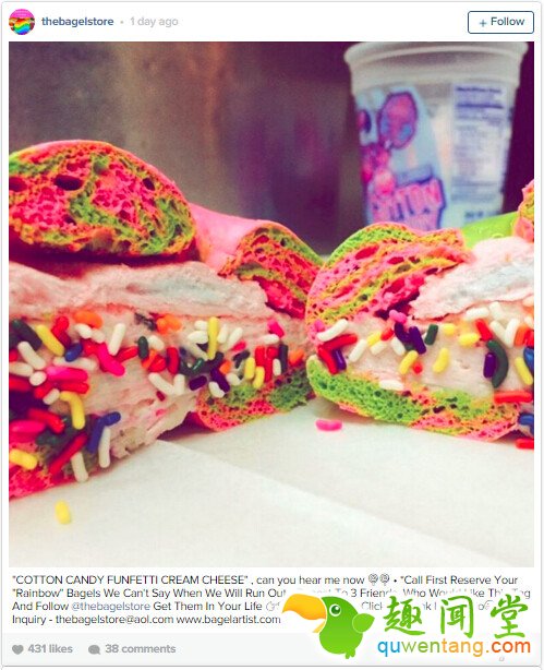 美媒评价,彩虹贝果的味道有点像麦片,可以涂上一层厚厚的Funfetti式奶油奶酪一起吃。