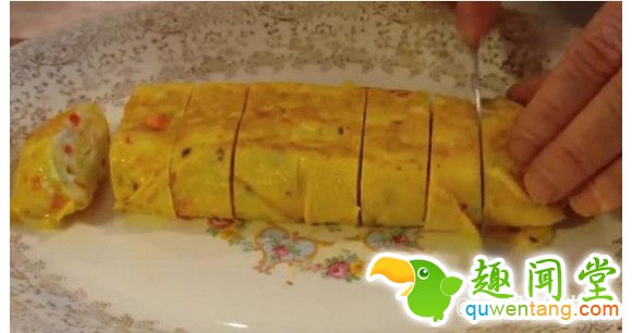 6. 然后接着卷,大约把三个蛋饼卷在一起。