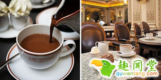在瑞士怎么能少的了美味的热巧克力呢。有人说这里的热巧克力仿佛可以令人置身在天堂中,享受着莫大的愉悦。5、法国巴黎,安吉丽娜茶室(Angelina)安吉丽娜茶室在巴黎非常有名,自1903年开业至今,曾经接待了无数的时尚名流,甚至包括可可-香奈尔。