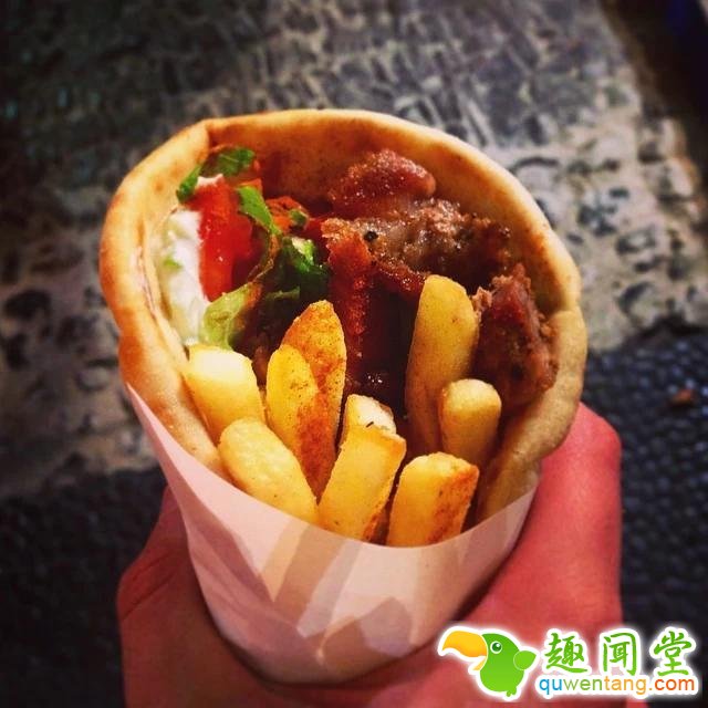 卷饼内有烤肉、蔬菜和薯条,一口咬下去很满足