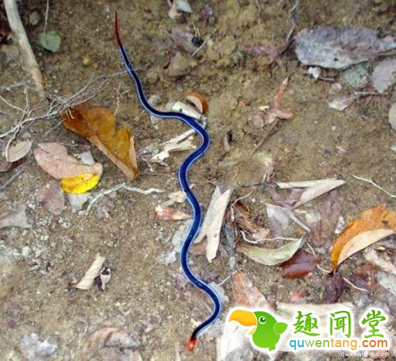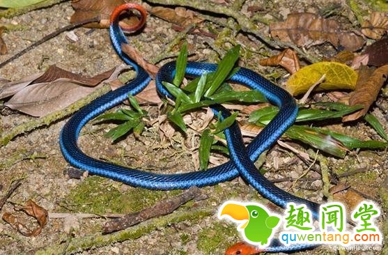 ▼蓝长腺丽纹蛇全身呈现具有光泽感的宝蓝色,头部和尾部则是鲜艳的红色。