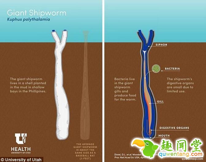 巨型凿船虫属于双壳类动物,与蛤与蚌为同一类,终身躲在硬壳中,头部朝下藏身于泥地中,以泥土里的食物和海底沉淀物维生。他们体积十分庞大,可以达到长度1.55公尺、直径6公分。