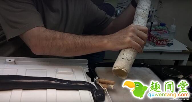 画面中,科学家先从较粗的一端切开凿船虫的壳,再轻轻摇一摇,一条超长、身上覆有黏液的黑色生物从管状硬壳里滑出。