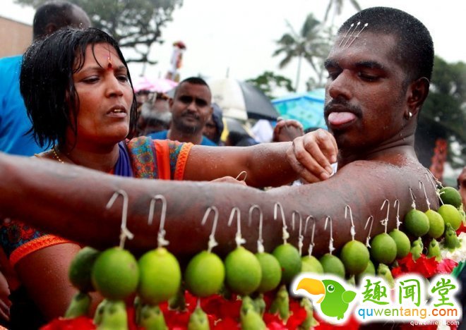 宗教的力量是强大的,强大到可以让教徒忘却一切痛苦,一切灾难,全心全意把自己的一切奉献出去。非宗教人士是体会不到这种力量的,图为在一个宗教仪式上,一名教徒在妻子的帮助下在手臂上打了许多挂钩,然后挂上青果,以示诚心。