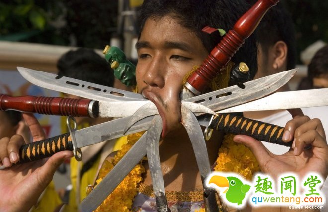 印尼的教徒在参加宗教仪式时自虐,将数把刀子直接穿过腮帮子。