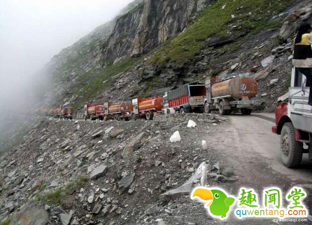 海拔超过4000米的道路,虽然道路非常狭窄,可是是运输货物非常重要的一条道路。