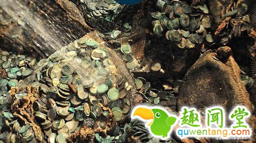 他发现,真的不是自己的错觉,光是实实在在存在的,于是赶紧朝着金光游去。认真打量一番,只见一些圆圆的东西堆砌在一起,上面还有厚厚的一层沙土,周围还有一些散落的分布在附近,看起来不像是垃圾。