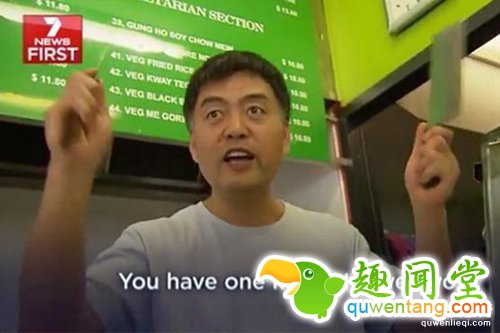面馆老板亨特·胡(音译)假装照着年轻人的要求去做。