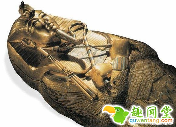 上文提到棺材,那就说说黄金王棺。它是以纯金制成,局部以珠宝翡翠点缀而成,图示为安置图坦卡曼王的木乃伊而做的其中一层棺材。其形象是图坦卡曼王的相貌,但极富装饰性。