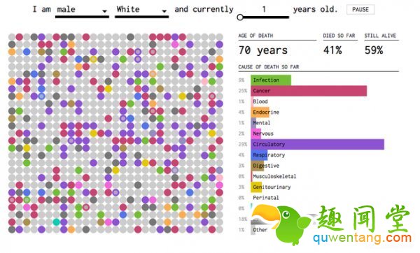 输入你自己的年龄、性别和种族后先别急着离开。调整参数,查看结果的变化也很有意思。不知道你发现没有,如果你越年轻,你就越不可能死(废话…)。好吧,这条不算新鲜,但是看着自己随着年龄增长,死法一年换一个花样也是蛮魔性的。比如说,假如你在20岁前死了,你最可能死于围产期,先天疾病或者外部原因。假如你在50多岁挂了,最可能的死因就是癌症或者心脏疾病。