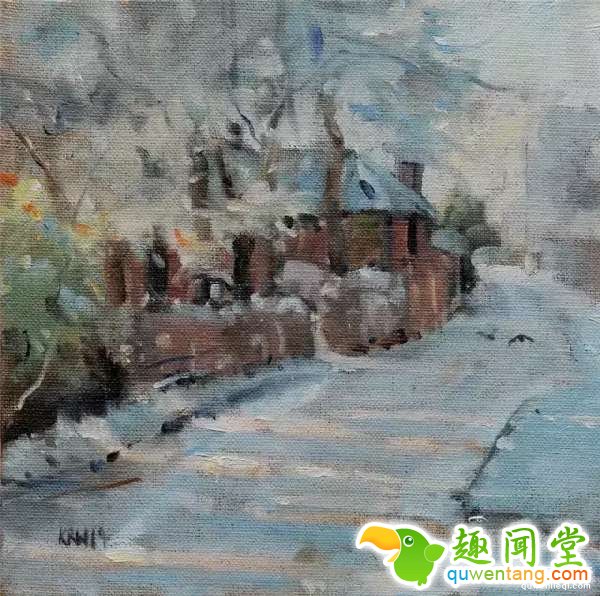 Kieron的画不同于其他同龄人的作品,他不喜欢用浓烈的色彩,也不喜欢对比鲜明的构图。事实上,无论是笔触还是选景,都让人深觉Kieron有超乎他年龄的成熟——灰黄色的天、蓝色的人、浅棕色的房子和黑白色的飞鸟,浅淡却不失层次。