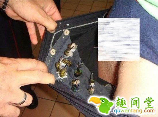 为了防止蜂鸟在裤裆内活动和鸣叫,该男子给这些蜂鸟注射了镇静剂,还特地用一块布把蜂鸟全身包裹地紧紧的,让它们动弹不得。