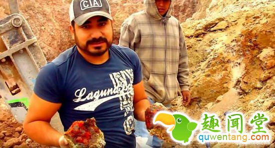 一男子拿着一个小铁镐在一个乱石堆里挖东西。最终他们挖出的东西打破了世界纪录。此刻他们正拿着小锤敲敲打打,谁也不知道下一步会出现什么奇迹。
