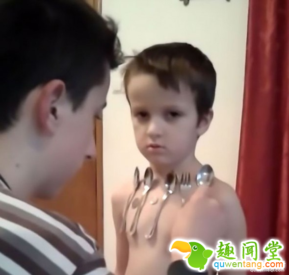 外国5岁小男孩Erman Delic有一天看电视的时候突然发现勺子能吸在身上不掉,换成叉子一试也能吸住,又换成硬币一试还能吸住。