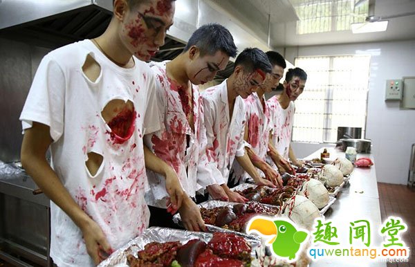 最夸张的是,该学院食堂推出了应景的节日大餐——恐怖黑暗料理“人体”大餐,什么“人眼”泡汤、麻辣“人脑”……各种逼真而极恐“大餐”将恐怖黑暗料理推到了极致。