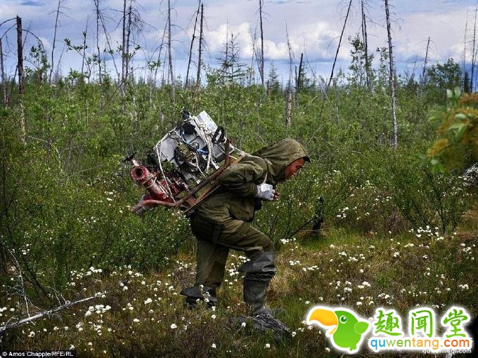 来自新西兰的摄影师Chapple通过“贿赂”才得以潜入猎人内部,在和他们相处的3周里,Chapple只能负责一些类似砍柴的初级工作。据Chapple透露,由于环境艰险,猎人们通?;崴嫔硇智够蛘呋鹎梗苑酪笆蕹雒?。图为猎人背着工具箱,他们主要使用高压水枪来搜索遗骸,水枪由某种烟雾发电装置供电。