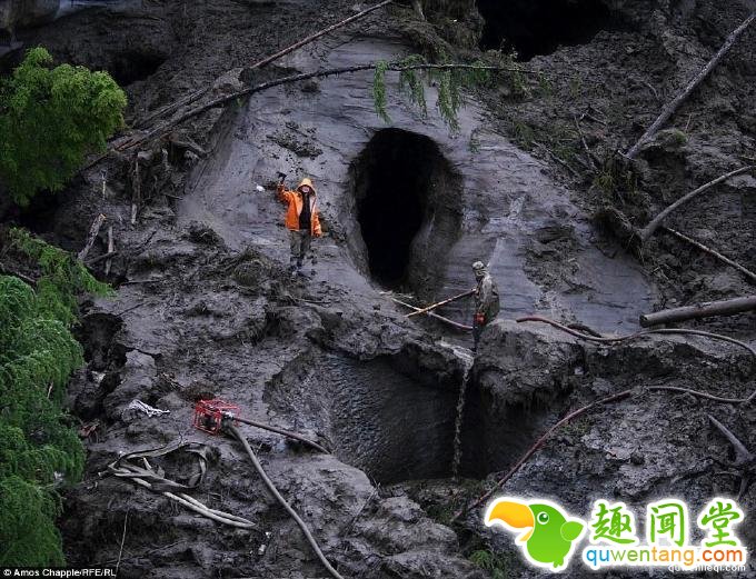 图为猎人使用高压水枪在山洞外寻找猛犸象遗骸,这种操作方式对当地生态造成严重破坏。