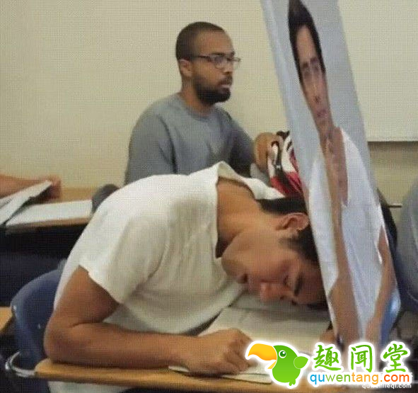 现在的学生为了上课能睡会觉想出各种办法,下面这个学生的方法看着还比较安全,他趴桌子上睡觉,前面用一个自己正常坐姿拍下来弄成一幅大的照片,看似很正常,只要老师从旁边一看就露馅了。如果老师在讲台不走动是没问题的!