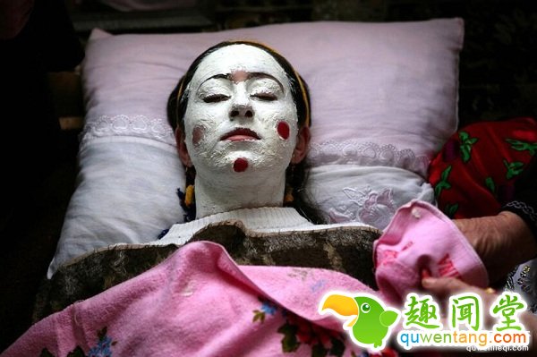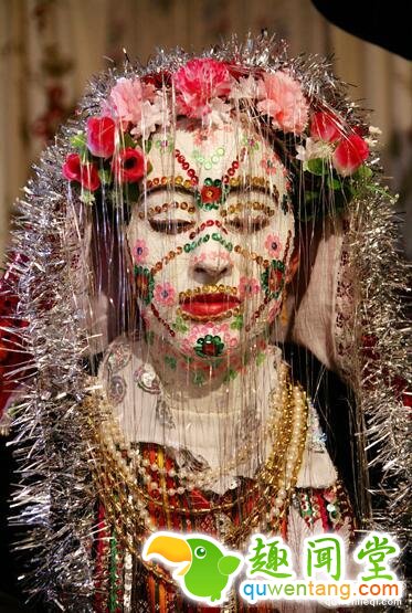 在保加利亚西部的里布诺沃村有种传统习俗,婚礼当天,新娘要化“僵尸妆”。脸上涂满白色涂料,用鲜艳的口红上色,亮片点缀。据说是以前的新郎从未见过新娘,老一辈的人就把新娘脸上贴满“障碍物”让新郎慢慢清理,学会温柔对待新娘。