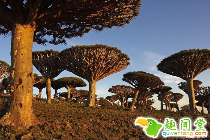 索科特拉岛颠覆了人们脑海中所有对“正常”景色的印象,岛屿景象仿佛来自另一个星球或者来自地球远古及未来的某个时期。岛上的人口将近44000人,因为长期远离大陆,很多居民的遗传谱系在世界上绝无仅有。图为岛上成片的龙血树。