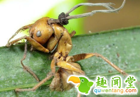 寄生菌,本图中蚂蚁的头部长出了一朵蘑菇。这种奇怪的现象是由一种的寄生菌所致。寄生菌感染蚂蚁的大脑让其变成僵尸蚂蚁,然后驱使僵尸蚂蚁前往最适宜真菌生长和传播的场所,最后再杀死蚂蚁。研究人员认为,全球热带雨林中可能有数千种此类真菌