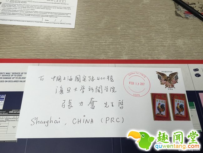 局长瑞秋为张力奋寄给自己的信选择了鸡年邮票。