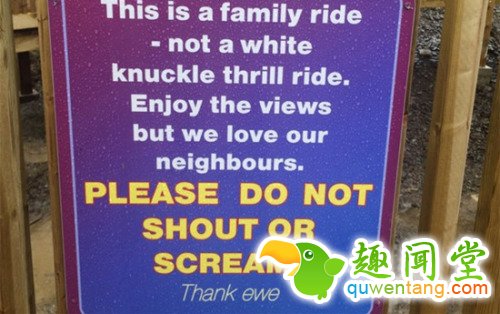 英国西南部的云霄飞车有400米长,一次能乘载28位游客,被称作英国德文郡“最大、最高、最快”的云霄飞车。但为了避免附近住户抗议噪音污染,游乐园竖起了告示牌:“请不要喊叫或尖叫!”(Please do not shout or scream!)