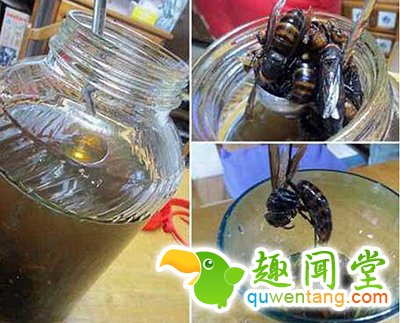 7【黄蜂酒】日本大黄蜂是一种毒性极强的蜂类动物,然而,还是有人愿意以身犯险,即使挨上几蜇也要想方设法捉到它们,为的是酿一种特殊的酒?;品渚瞥氏殖鲆恢掷媚喟偷难丈椅牌鹄从械阆窀⒎⒌钠?。
