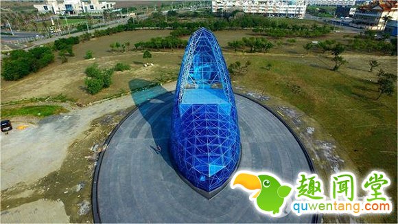 这个建筑由320多块有色玻璃面板制成,这个闪闪发光的“大蓝鞋”宽超过10米,总共耗资2300万新台币(68万美元)。