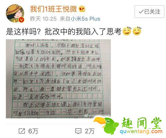 简单来说,在这位小学生的眼中,人越活时间越多。是这样吗?看完这篇作文,批改中的王老师就陷入了思考,所以将这段文字晒在了微博上。