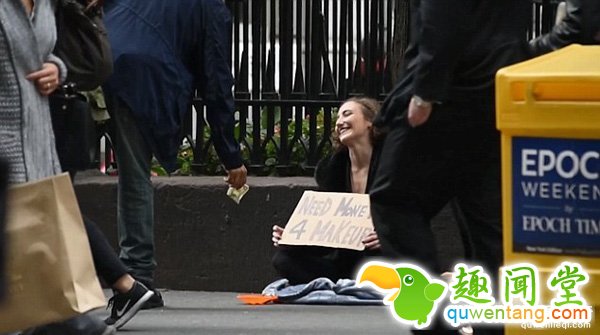 英国《每日邮报》近期开展了一项社会实验,并于10月17日公布了相关结果。在拍摄的实验录像中,一位名叫安吉拉(Angela)的女子以没有钱买化妆品的理由在美国纽约市华尔街进行乞讨,结果竟在一个小时内获得20美元(约合人民币134元),令人出乎意料。