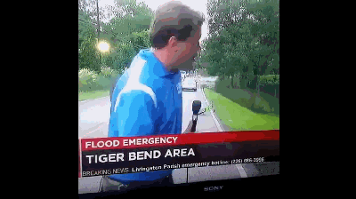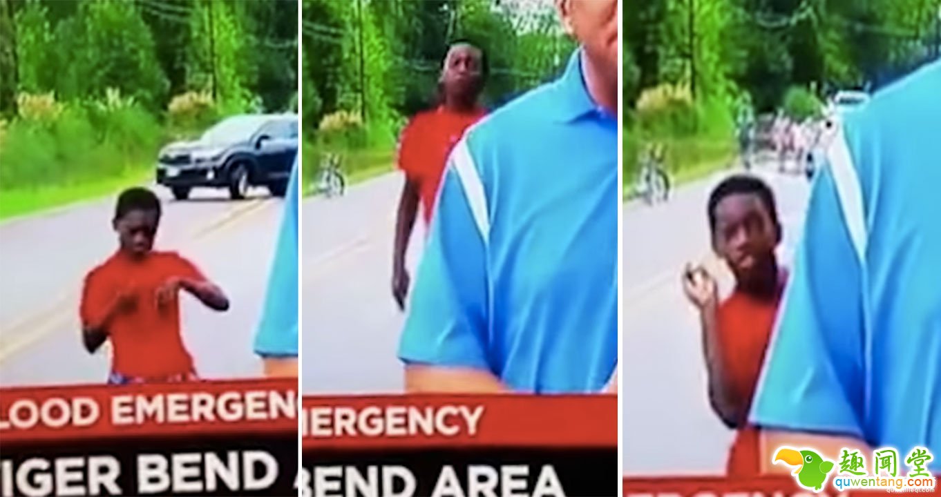 近日,美国WAFB电视台(美国哥伦比亚广播公司CBS附属电视台,驻路易斯安那州首府巴吞鲁日——观察者网注)记者在洪灾现场进行报道时,一个熊孩子躲在记者背后,以一段“精湛”的即兴舞蹈实力抢镜。